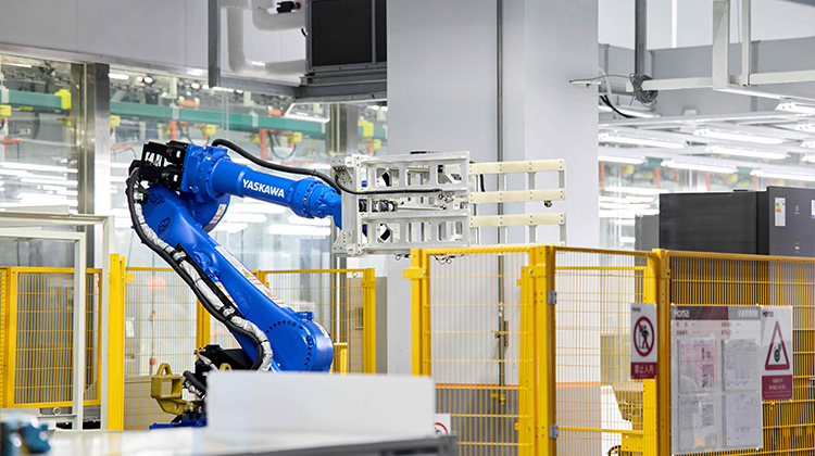This robot on the packaging line is responsible for lifting refrigerators and replacing the packaging backing plates. Throughout the factory tour, you’ll notice various robotic applications, such as transporting side panels, back panels, box interiors, and more. We believe digitalization isn’t about automation without people. At Homa, we emphasize the collaboration between humans and machines—robots take on monotonous, dangerous, and error-prone tasks, while employees focus on creative, value-driven work.
