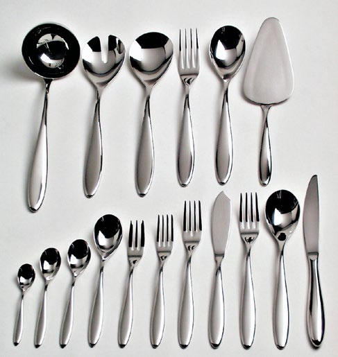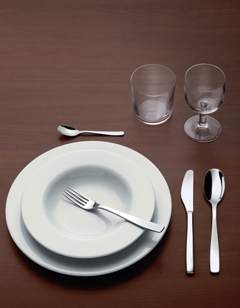 Compared to twenty years ago, the mise en place was simplified by eliminating superfluous elements and focusing on the essentials. Cutlery collections have been drastically downsized in favour of sets composed of only the four main utensils. Above, the Mami cutlery set designed for Alessi by Stefano Giovannoni in 1999, below, the KnifeForkSpoon cutlery series designed by Jasper Morrison for Alessi in 2004.