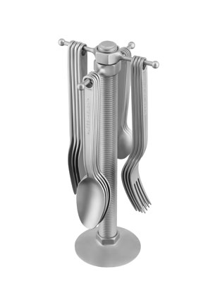 In 2022, Conversational Objects was launched: a 16-piece cutlery set paired with a candlestick and a cutlery holder resembling a threaded bolt, inspired by the world of mechanical workshops. The collection aims at stimulating conversation over the ritual of the meal, envisioning the table as a stage for dialogue.