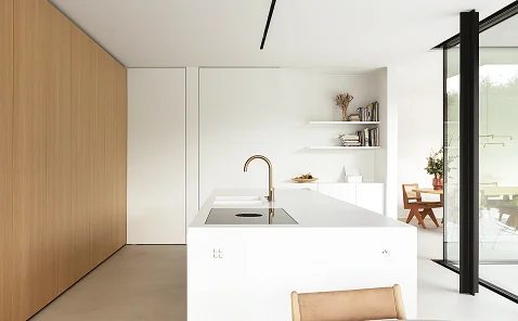 In terms of spatial organisation, the kitchen of the 2020s is not only hybrid and integrated, but also highly adaptable, sharing key functional elements with the living area, such as large tables, bookcases, shelving, and modular, customisable panelling systems that connect or separate rooms as needed. At the heart of this new versatility is the island, which becomes increasingly equipped and technological, featuring on-demand modularity that allows worktops to double as dining tables or spaces for smart working or study. This functional transformation also responds to a growing desire for order, cleanliness, and a shift in atmosphere, moving beyond the simple act of cooking. As a result, the kitchen can now be concealed behind engineered door systems that hide equipment, appliances, pantries, and sinks, leaving behind a minimalist island that is almost unrecognisable.