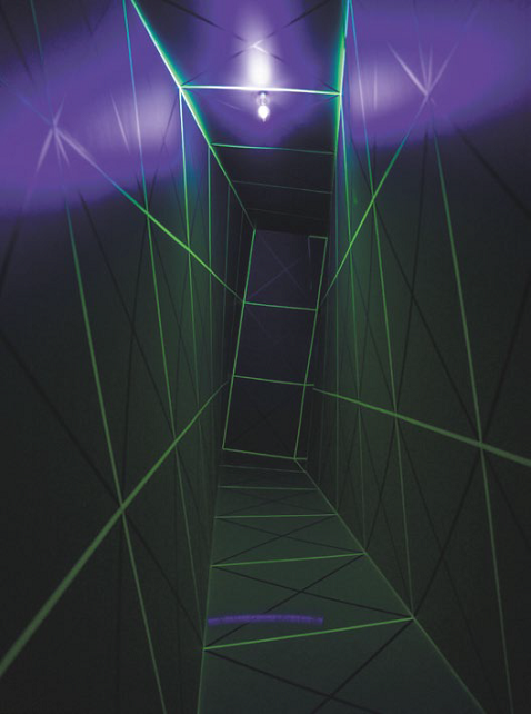 The work consists of a completely dark cubic room crossed by fluorescent elastic cords arranged in an orthogonal grid. The immersive effect is powered by black elastic wires lit by Wood lights and moved by electromechanical motors. The result is an unstable, ever-changing space in which the grids continuously distort. Spatial coordinates appear to float, and anyone inside loses fixed reference points, confusing vertical with horizontal.