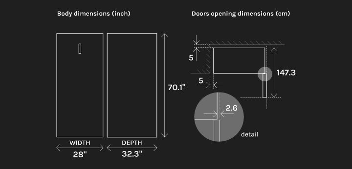 | Product Dimension WXDXH (mm) | 710x820x1780( 28″×32.3″× 70.1″) |