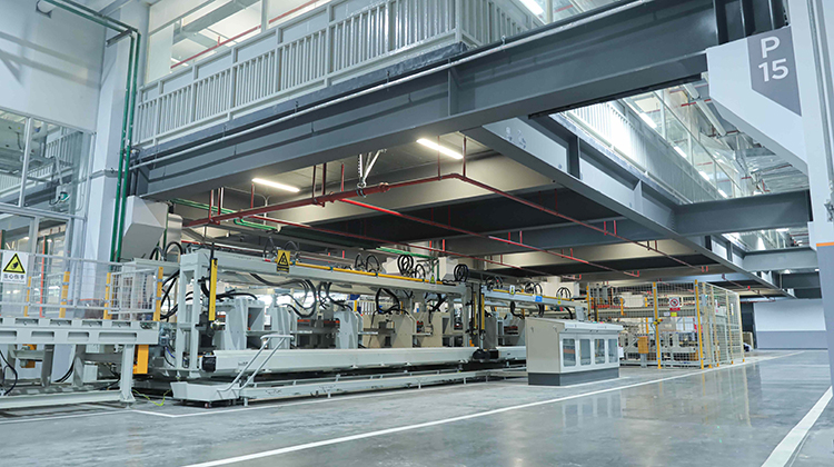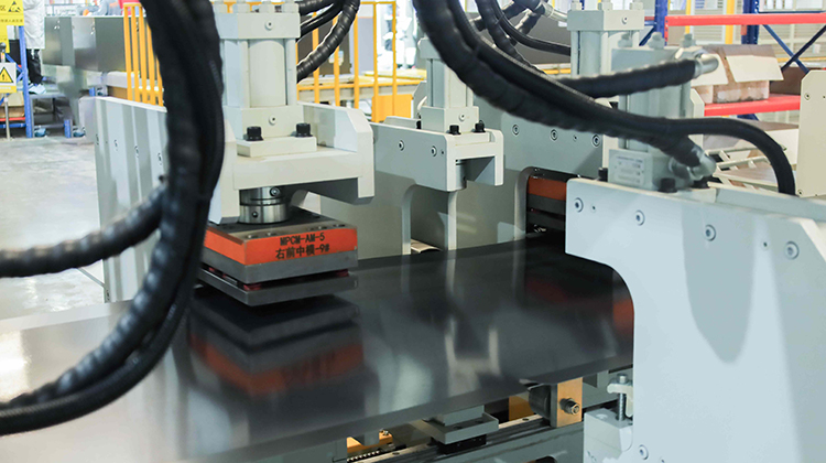 Fully auto machinery for handling cutting, rolling, condenser pipe sticking and U-shell bending all in one line. Here is the first process of refrigerator side panel forming: punching and cutting the edges & corners of the metal sheet.