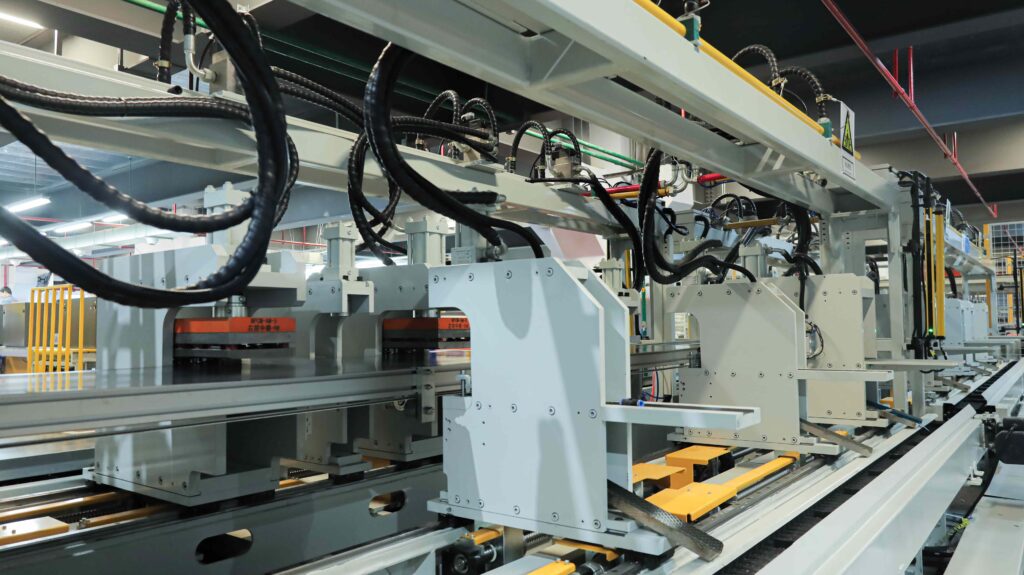 Fully auto machinery for handling cutting, rolling, condenser pipe sticking and U-shell bending all in one line. Here is the first process of refrigerator side panel forming: punching and cutting the edges & corners of the metal sheet.